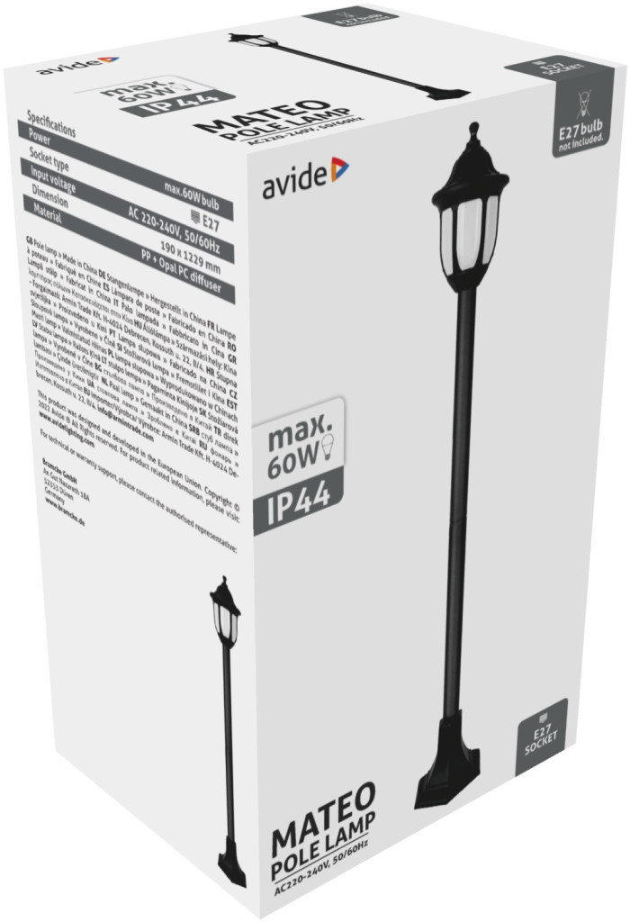 Avide Kültéri Álló Lámpa Mateo-XL 1220mm 1xE27 Fekete IP44