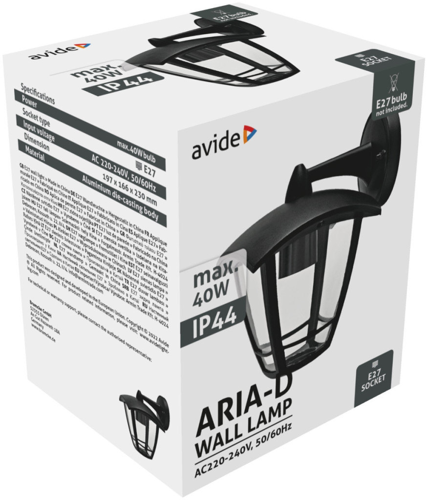 Avide Kültéri Fali Lámpa Aria-D 1xE27 Fekete IP44
