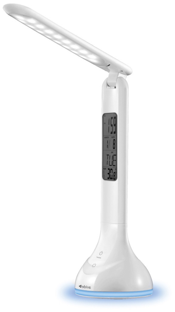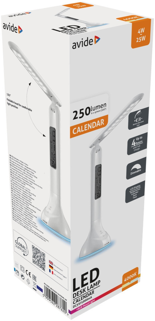 Az Avide RGB Calendar asztali lámpa egy 4W-os teljesítményű, természetes fehér színhőmérsékletű, fényerőszabályozható, LCD kijelzővel, RGB hangulatvilágítással és beépített akkumulátorral is rendelkező termék, mely elérhető fehér, fekete színben valamit fa mintázattal is.