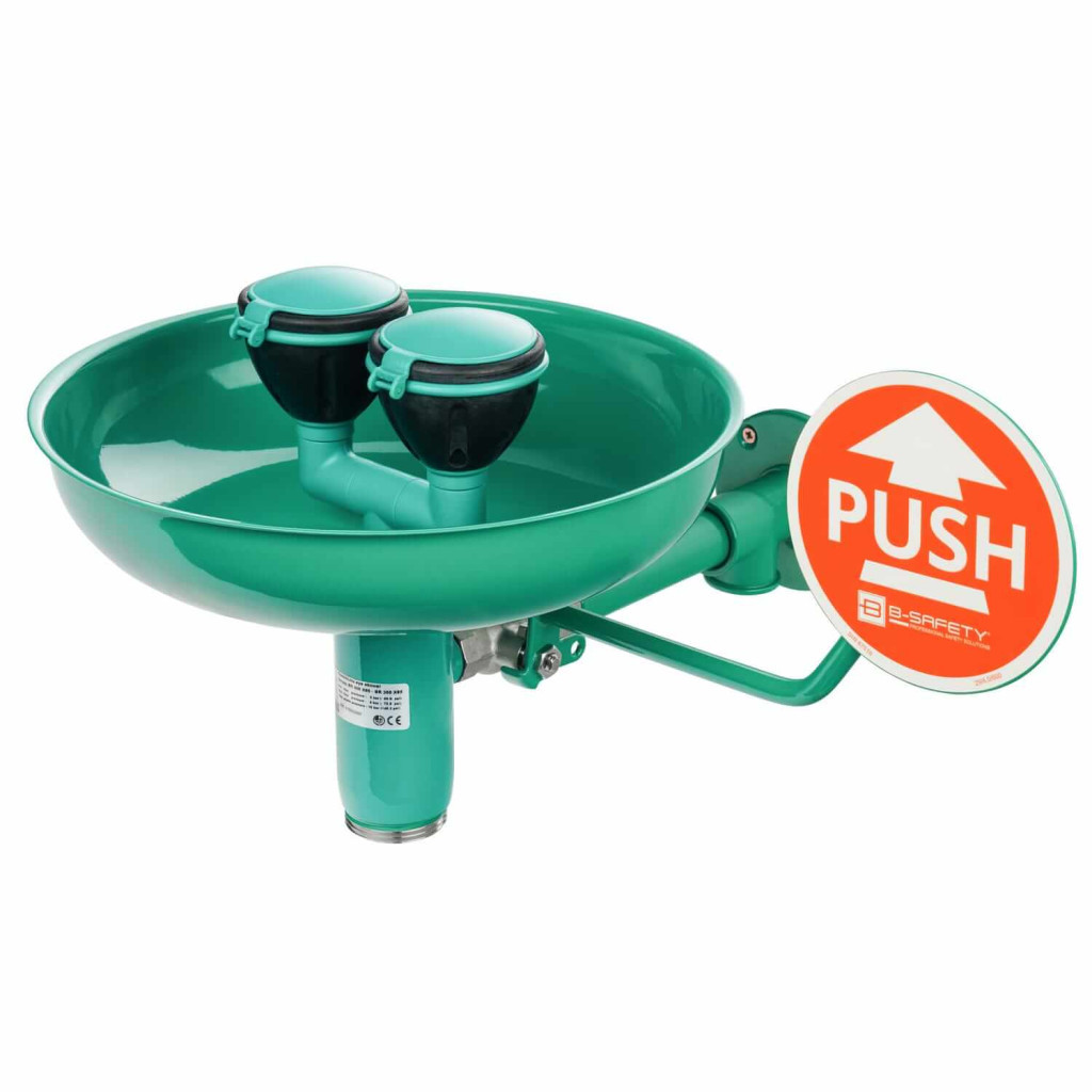 A rögzített szemzuhanyok a legjobb megoldást jelentik számos laboratóriumi, raktári és ipari alkalmazáshoz. Ezek a zuhanyok mindig minden oldalról jól láthatóak. A nagy PUSH kar fotolumineszcens, így az könnyen megtalálható a sötétben vagy rossz látási viszonyok között. A gyűjtőtálas szemzuhanyok felfogják a használt vizet, és leürítik azt. A szem- és arczuhanyok gyűjtőtállal és fedővel olyan helyeken használhatók, ahol sok a por és szennyeződés. Nagy teljesítményű szórófej a visszafogott, egyenletes és lágy vízugárért a vegyszerek szemből történő kiöblítésére optimalizálva. Beépített automatikus áramlásszabályozó a megfelelő, víznyomástól független sugármagasság eléréséért. Fotolumineszcsens kar a sötétben is jó láthatóságért. Védőgumi a zuhanyfej körül, hogy megvédje az elsősegélyre szorulót az ütés okozta sérülésektől. A porvédő kupak víznyomás hatására kinyílik, amikor a szemzuhany működésbe lép. Nagy lyukak akadályozzák meg a zuhanyfejben az állóvíz felgyülemlését és ezzel a vízkő-képződést. Vízbemenet: 3/4?-es hüvelyes. Áramlási sebesség: 14 l/perc.