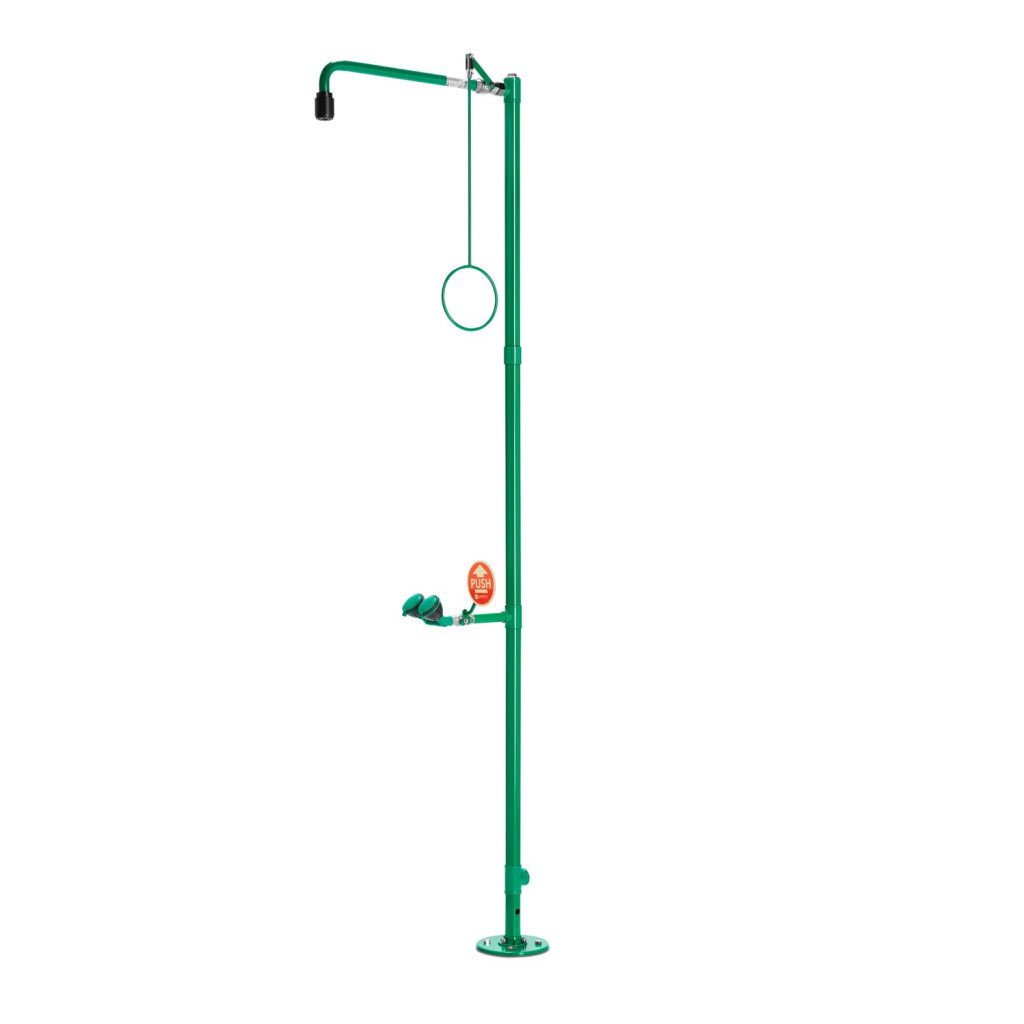 A szabadon álló ipari biztonsági zuhanyok minden olyan helyen használhatók, ahol a zuhany falra szerelése nem lehetséges, vagy ahol központi hozzáférési pontot kell létrehozni az elsősegélynyújtáshoz. Nagy ipari csarnokokban és termelési létesítményekben is érdemes használni őket. Nagy előny, hogy a zuhanyzó minden oldalról jól látható. A szabadon álló vészhelyzeti zuhanyok opcionálisan a helyi körülményekhez igazíthatók, a kiegészítők széles választékával. Nagy teljesítményű zuhanyfej a visszafogott, egyenletes és lágy vízsugárért a vegyszerek szemből történő kiöblítésére optimalizálva. A robusztus kialakítás alkalmas a mindennapi nehézipari használatra is. Tökéletes beállítást biztosít a vészhelyzeti testzuhany a helyszíni veszélyes helyzetekhez igazodva a percenként 50 és 110 liter közötti választható térfogatáramnak köszönhetően. Önleeresztő, nagymértékben vízkőmentes és karbantartásmentes, valamint nagyon tartós és korrózióálló. Az állítható vészhelyzeti testzuhanyok a helyszíni körülményekhez igazodnak. Vegyszerálló poliészter porbevonat az agresszív környezetben való használatra. Vízbemenet: 1 ??-es hüvelyes. Testzuhany áramlási sebessége: 75 l/perc | 20 GPM. Szemzuhany áramlási sebessége: 14 l/perc.