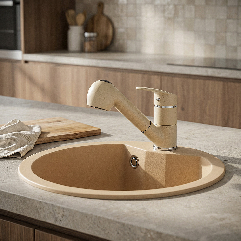 A Carol bézs színű konyhai kihúzható csaptelep a modern konyhák kedvence. Egyesíti a letisztult design eleganciáját a mindennapi funkcionalitással. Bézs árnyalata tökéletesen harmonizál a gránit hatású vagy világos mosogatótálcákkal, így egységes, igényes megjelenést biztosít a konyhapultodnak.