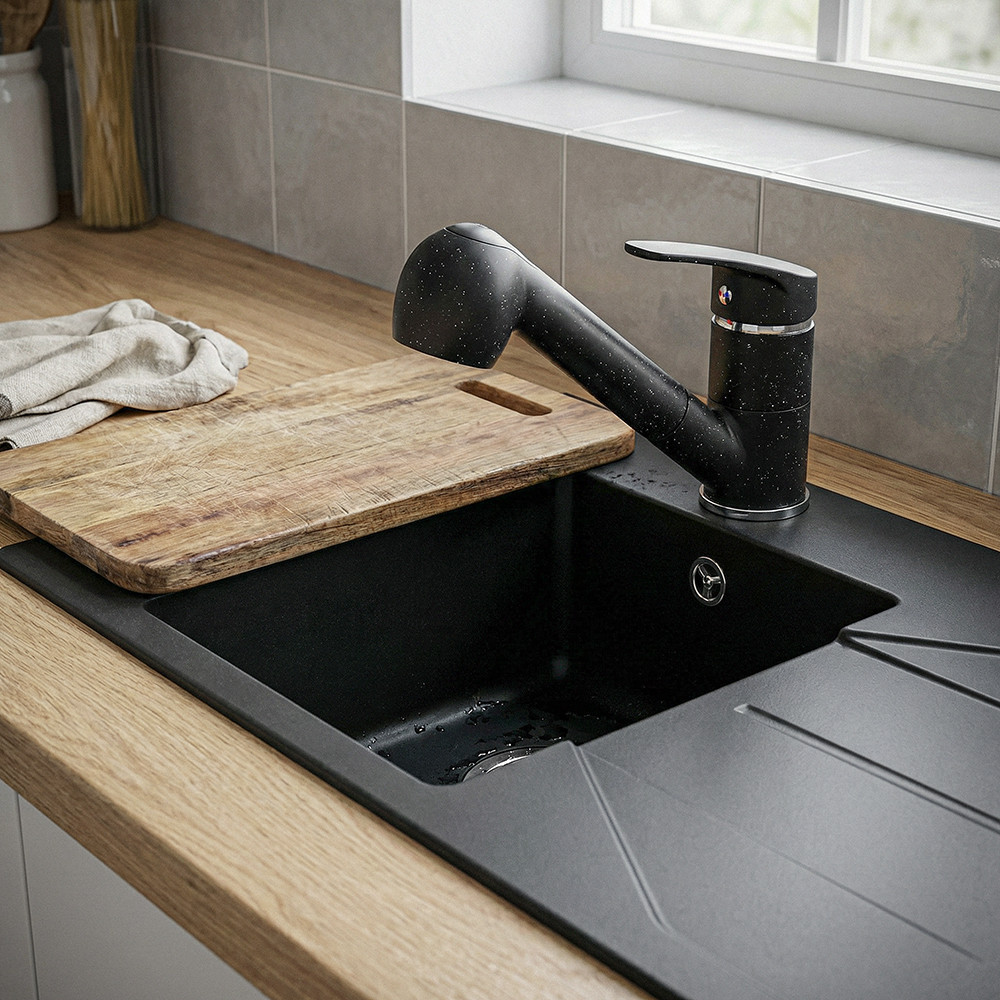 A Carol fekete csaptelep különlegessége, hogy színe és textúrája illeszkedik a fekete gránit mosogatókhoz. A finom, szeplős mintázat és a selyemfényű felület természetes, harmonikus összhatást teremt, így a csaptelep nemcsak használati eszköz, hanem a konyha látványeleme is.