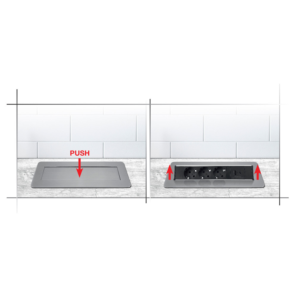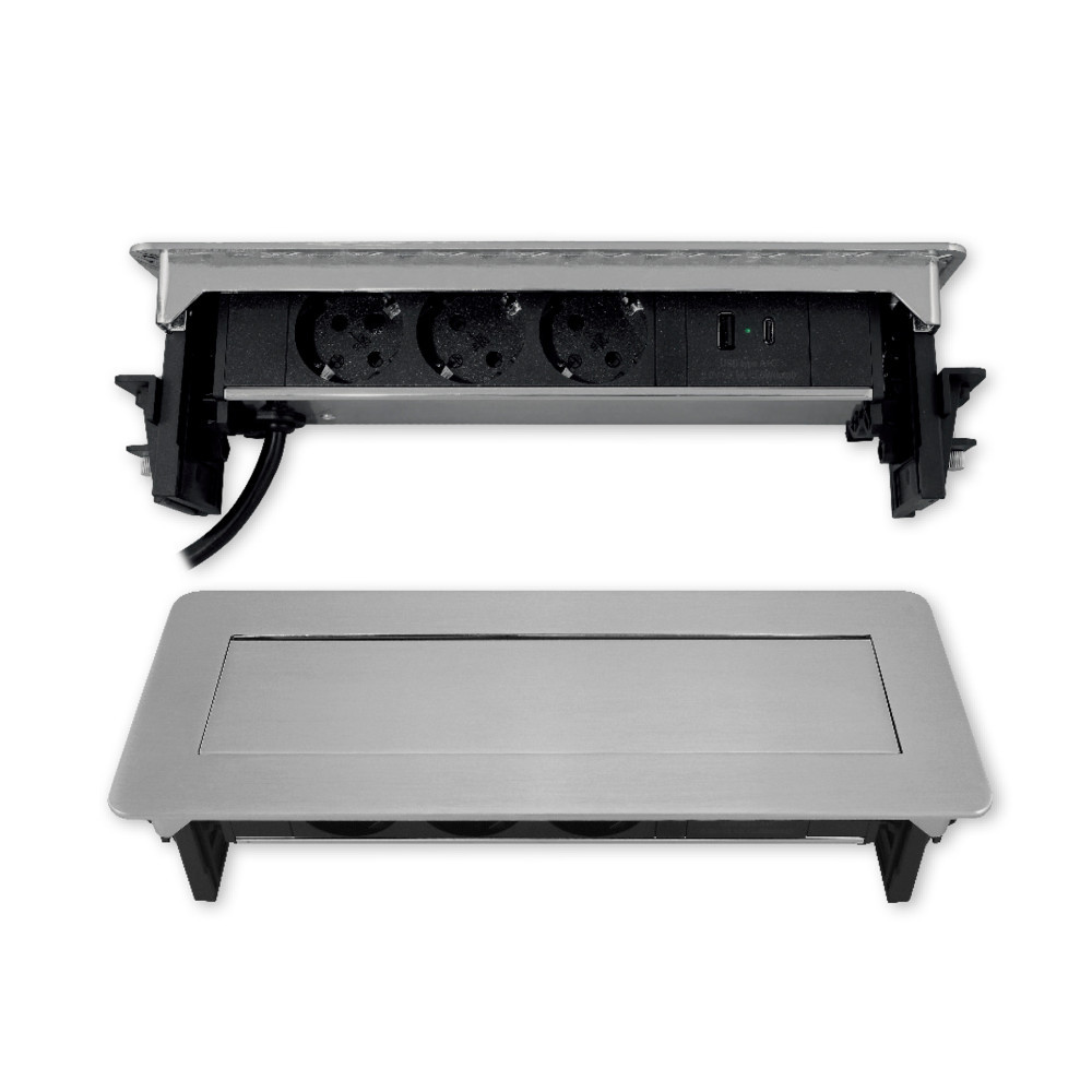 Commel bútorba süllyeszthető,rejtett elosztó 3 db aljzat, USB A+C nikkel ezüst, 16A 3680W