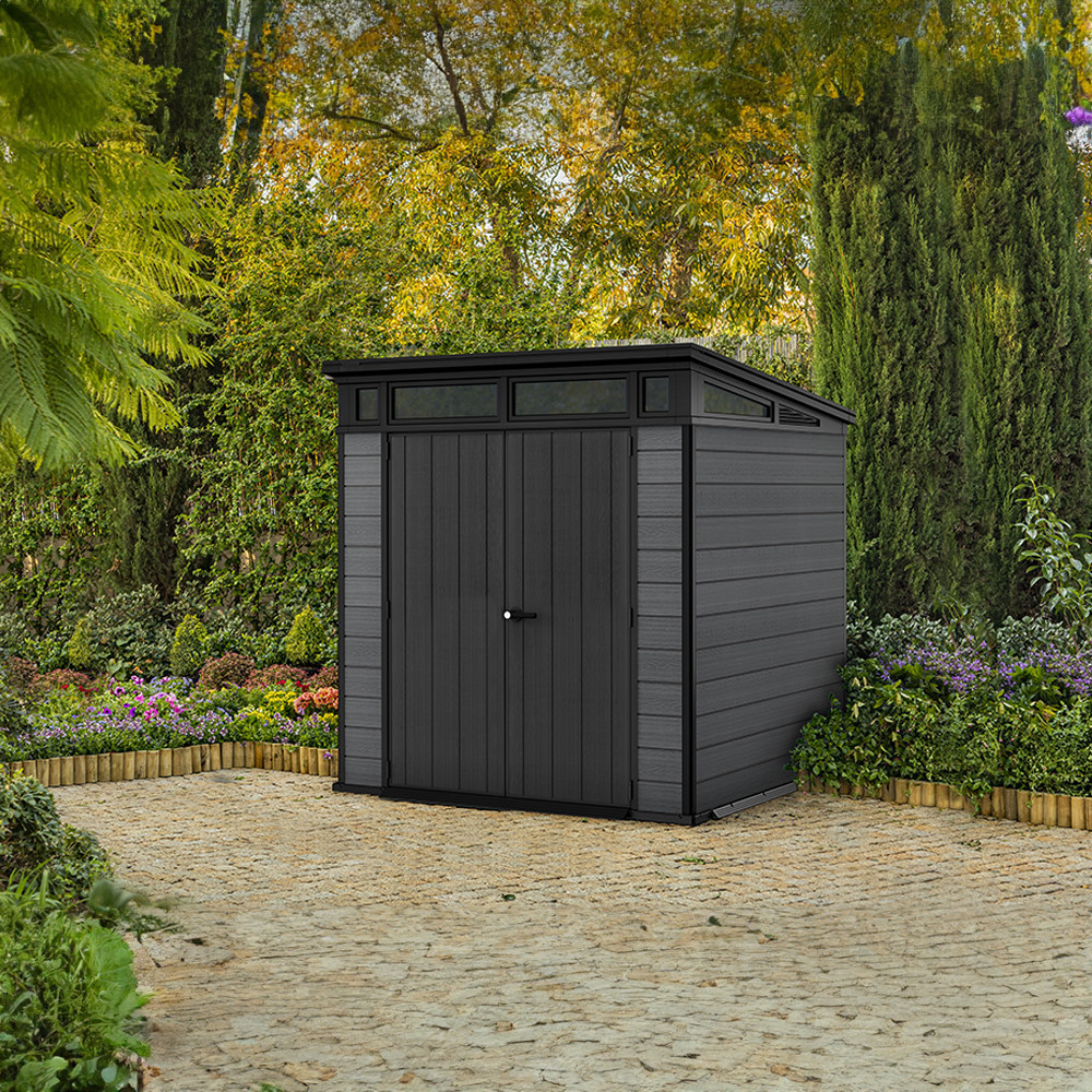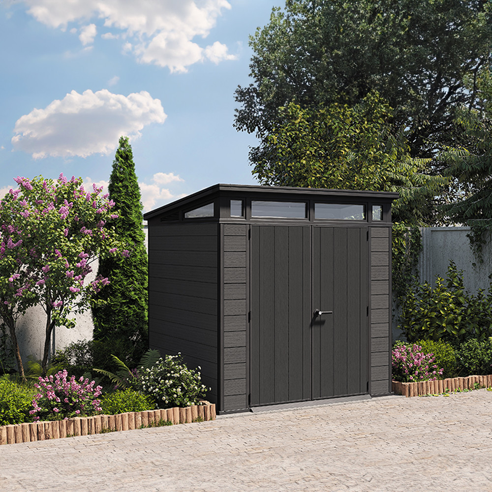 A Cortina kerti ház formatervezése a modern építészeti vonalakat követi. A ferde tető és az ablaksáv feletti dizájnja az egyszerűség és elegancia jegyében készült, amely tökéletesen illeszkedik a modern kerti környezetbe, miközben praktikus tárolóhelyet biztosít.
