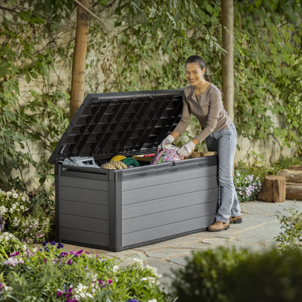 A Cortina Boxokkal újítsd fel kültéri teredet. Az EvotechTM kompozitból készült, ez a kültéri tárolóeszköz rendkívül erős, minden időjárásnak ellenáll és UV-védett. Mondjon búcsút a hámlásnak, rothadásnak és rozsdásodásnak – a Cortina Boxok tartósak, karbantartásmentesek. A hidraulikus dugattyúk simán kinyitják a vízálló, zárható fedelet, így megfelelő 380, 570 és 757 literes térfogat látható. Tökéletes minden otthoni és kerti cucchoz. A Cortina Boxek csodálatos és rendezett teret teremtenek, ahol szezonról-szezonra élvezheti.