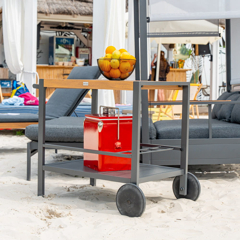 A bútor kidolgozásának minősége a tartósságban is megmutatkozik. A kerekes zsúrkocsi porszórt alumínium vázzal rendelkezik, amelyet fokozott korrózióállóság jellemez, ezért tökéletes megoldás kültéri használatra. Az alumínium lapokból készült felső rész stabil, így bármilyen ételt, italt elhelyezhet rajta. A szállítása egyszerű a nagy kerekeknek és a praktikus fogantyúnak köszönhetően. A felhasznált anyagok a bútor tartósságát jelentik, amely hosszú ideig szolgálhat.