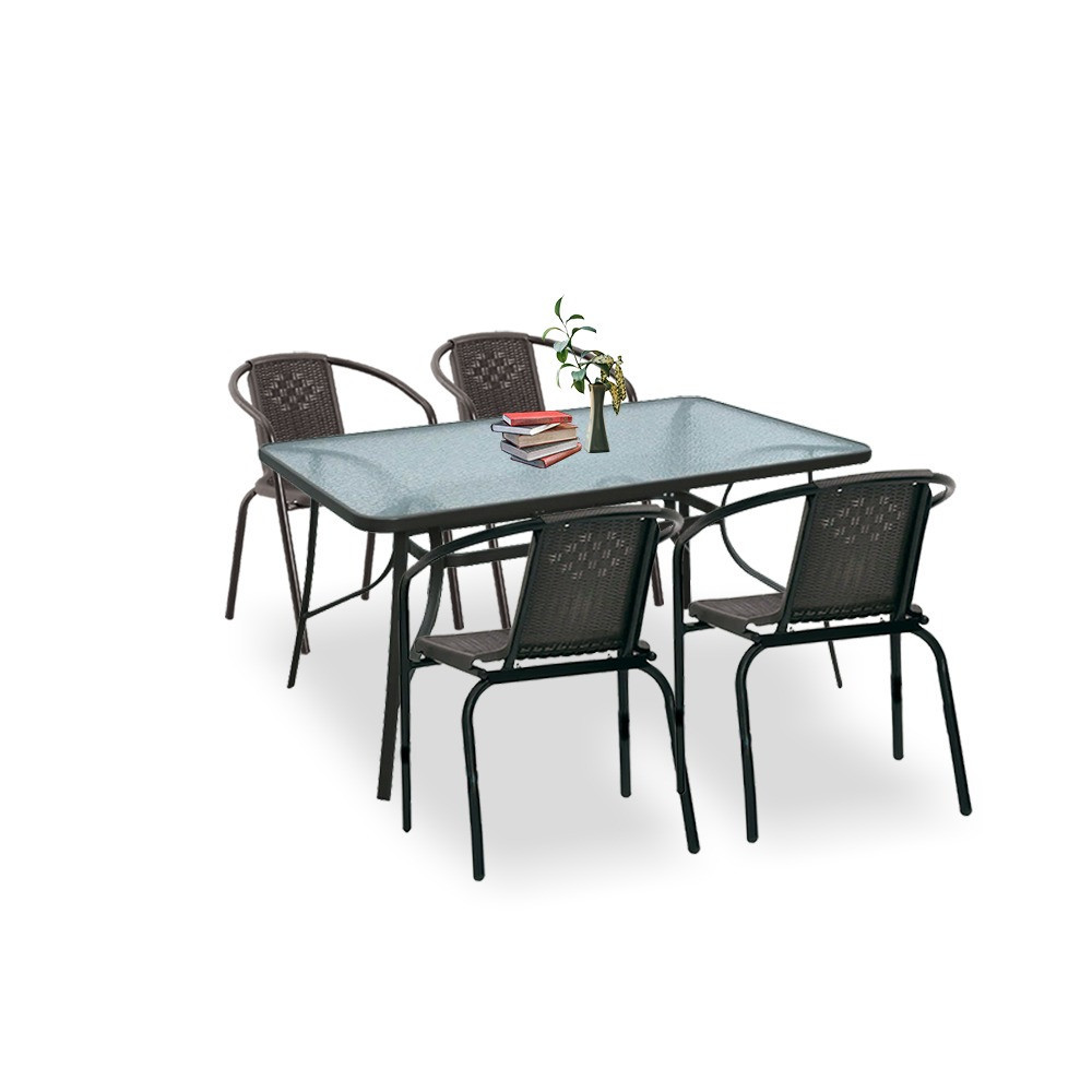 A modern kivitelű kerti bútorkészlet egy kerti üveglapos asztalt és 4 széket tartalmaz. A bútorokat 4 fő számára tervezték. A székek és az asztal lábazata fémből készül. Az asztallap 5 mm-es edzett üvegből készült, amely ellenáll a kisebb karcolásoknak. A műanyag szék ülésanyaga ellenáll az időjárási viszonyoknak. Előnye az ergonómikusan profilált ülés és karfa, amelyek tehermentesítik a vállakat pihenés közben.
