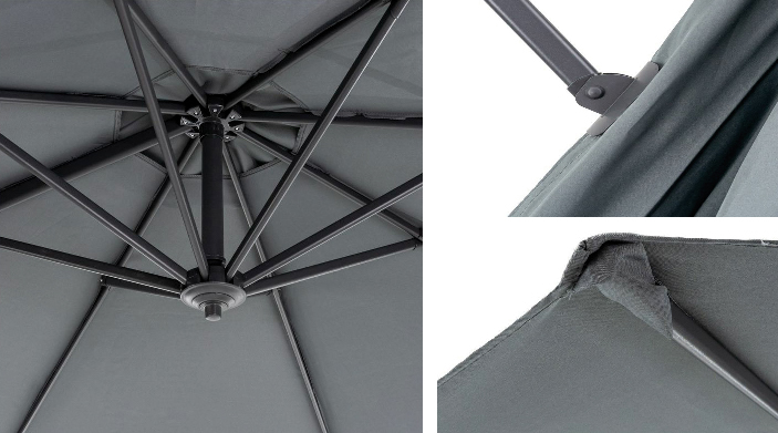 A Kazuar kerti ernyő szerkezete tartós alumínium csövekből áll. A Termék kivételesen széles ernyővel rendelkezik , amelyet 8 bordás szerkezettel erősítenek meg. Az ernyő elkészítéséhez további PA réteggel ellátott poliésztert használtunk. Alacsony vízfelvétel jellemzi. A felhasznált anyagoknak köszönhetően a nagy ernyő tartós és könnyen kezelhető, ami jelentősen befolyásolja az élettartamot.