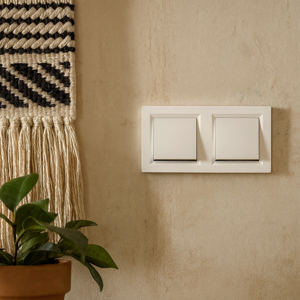 A váltókapcsoló süllyesztett kivitelben készül, így esztétikusan illeszkedik a fal síkjába. A dupla fehér keret lekerekített peremével modern, mégis visszafogott megjelenést biztosít, amely bármilyen enteriőrbe könnyedén beilleszthető. A kapcsolók működése precíz és finoman érezhető – egyértelmű visszajelzést ad minden kapcsoláskor.