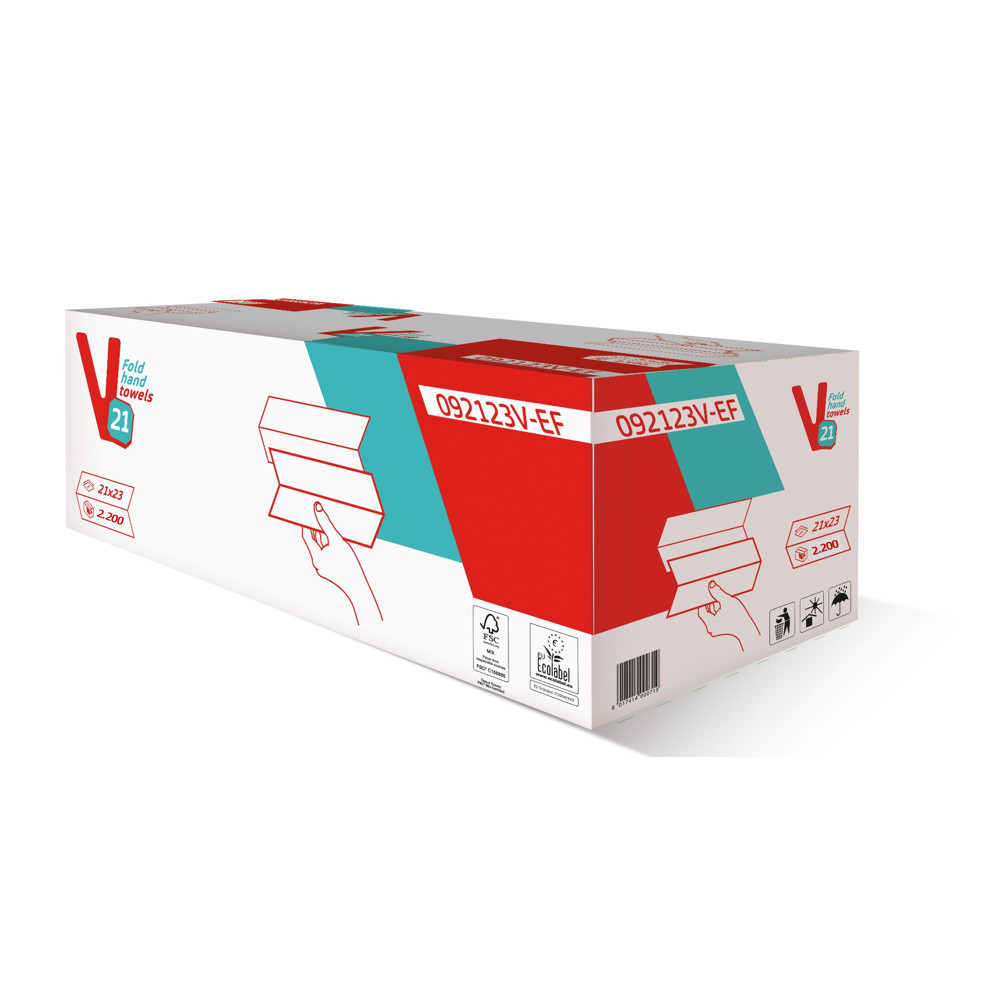 - V hajtogatott kéztörlő 2 rétegű, fehér, 21x23cm 100% cellulóz, 10x220lap/karton