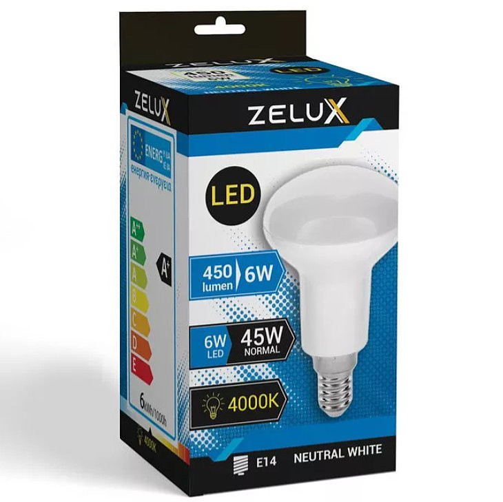 A Zelux termékcsaládot magas minőség és hosszú távú megbízhatóság jellemzi. A Zelux E14 6W R50 LED reflektív-fényforrások a 45W-os hagyományos izzókat helyettesítik, melyeknél ötvenszer hosszabb élettartammal, 80%-os energiamektakarítás melett működnek. A 6W teljesítményű Zelux LED izzó kiemelkedően magas, 450 lumen fényerőt biztosít, emelett 180 fokos szögben világít. A Led technológia hozzájárul a fenntartható jövőhöz, egyszerűbb, hatékonyabb mint az elődei. A Zelux Led fényforrásai akár 25.000 óra élettartamra is képesek, melyre 2 év gyártói garanciát biztosítunk. A fényforrások többféle formában, különböző színhőmérsékletben érhetőek el.