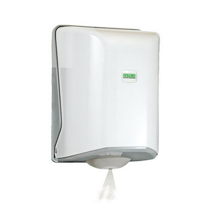 Vialli tekercses kéztörlő adagoló pont adagolással. A papírt egy szűkített nyíláson keresztül lehet kihúzni az adagolóból, ezáltal a perforáció mentén elszakad, így egyszerre csak egy lap kerül a felhasználó kezébe. 19 cm átmérőjű, perforált, belső mag adagolású tekercses kéztörlő papírral használható.